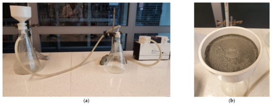 Vacuum filtration of cement paste through a Büchner funnel [33] ((a) shows filtration equipment, (b) shows cement paste after filtration).