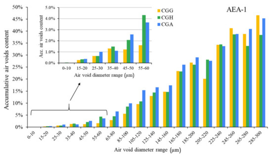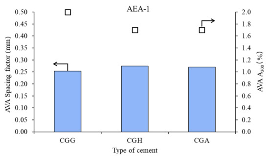 Air void parameters of hardened concrete in the case of AEA-1 (CGG—cement with high gypsum content, GDH = 0.11; CGH—cement high hemihydrate content, GDH = 0.37; CGA—cement with anhydrite addition, GDH = 0.17).
