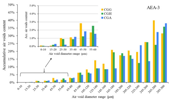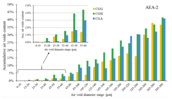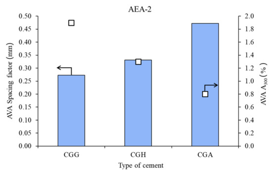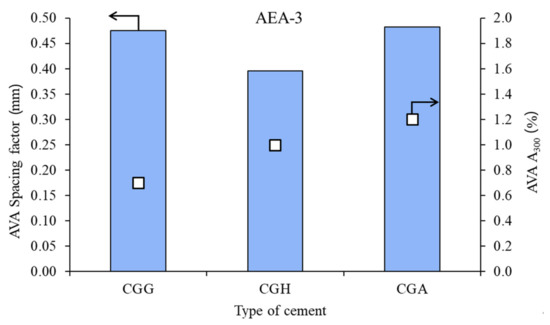 Air void parameters of hardened concrete in the case of AEA-2 (CGG—cement with high gypsum content, GDH = 0.11; CGH—cement high hemihydrate content, GDH = 0.37; CGA—cement with anhydrite addition, GDH = 0.17).