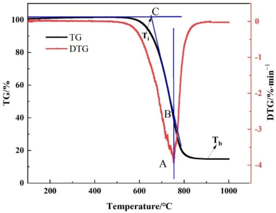 Firstly, Ti refers to the temperature at which the coke begins to burn. As shown in Figure 1, it can be calculated by the TG-DTG curve—that is, a vertical line is drawn at the peak point A of the DTG curve, intersecting with the TG curve at point B, and the tangent of the TG curve through point B. The tangent starts with the weight loss. The temperature corresponding to the intersection point C of the parallel lines is defined as the Ti [21]. Secondly, Tb is the temperature at which the coke combustion ends. The temperature at the point where the tail end of the DTG curve is approximately parallel to the X axis is defined as the Tb. Finally, vmax is an important parameter of the characteristics of the reaction coke, corresponding to the point where the reaction rate is the fastest in the weight-loss process, and the vmax is A at the lowest peak point of the DTG curve. The calculation formula of S is as shown in Equation (1) [21]: