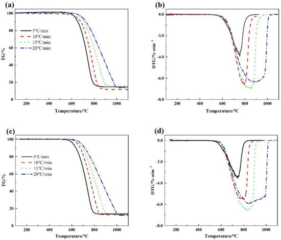 The thermogravimetric analyzer (HTG-2) produced by Beijing Hengjiu Scientific Instrument Factory (Beijing, China) was used. The thermogravimetric (TG) curve was selected, and the curve was differentiated to obtain the corresponding derivative thermogravimetry (DTG) curve for analysis. The test temperature range of the thermogravimetric analyzer was from room temperature to 1250 °C, the temperature accuracy was ±0.1 °C, the heating rate was 0.1~80 °C/min, the measurement range of the sample was 0~300 mg, and the mass accuracy was 0.1 μg. The Al2O3 crucible was selected in combination with the nature of the sample itself to ensure that the sample and the crucible did not react at high temperature, and to avoid the inaccuracy of the experimental data and the safety of the instrument. In this experiment, the sample was raised to 1100 °C from room temperature with heating rates of 5 °C/min, 10 °C/min, 15 °C/min, and 20 °C/min in the atmosphere.