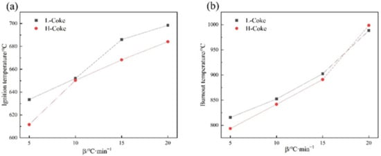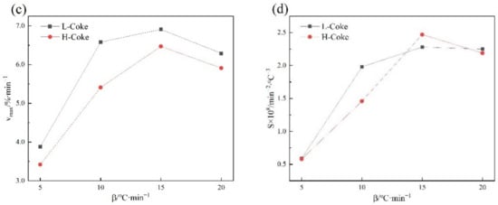 Figure 3 shows the combustion characteristic parameters of metallurgical coke at different heating rates. With the increase in the heating rate, all combustion characteristic parameters increased, among which the L-Coke was higher than the H-Coke.