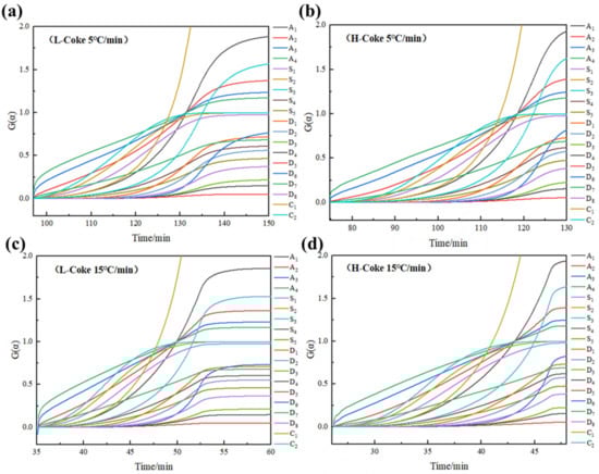 The equal conversion method and integral method are used to obtain the activation energy of coke combustion. The differential and integral functions of these theoretical models are detailed in Table 3. In this study, 19 kinetic models were investigated, as shown in Table 3. The G(α) versus t-plots were first established using the mechanism functions, including the nucleation and growth mechanism, chemical reaction, and mass diffusions, as presented in Figure 4 [23]. g(α) is the reaction mechanism function, and G(α) is the integral form of g(α).