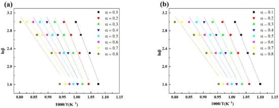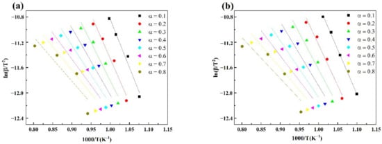 Fitting curves of ln(β/T2) vs. 1/T of coke based on the Vyazovkin method (a) L-Coke, (b) H-Coke.