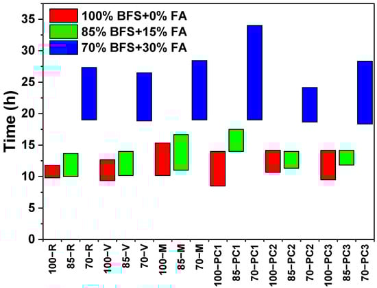 Figure 1 shows the variation in initial and final setting times of alkali-activated slag/fly ash mixtures with variation in fly ash content and chemical admixture. The setting time of the 100% BFS sample was an initial time of 9.8 h and a final time of 11.8 h, while those of the other samples were delayed: 10 h and 13.7 h for 85% BFS and 19 h and 27.3 h for 70% BFS. A higher proportion of fly ash in the alkali-activated slag/fly ash mixtures led to a slower setting due to the lower reactivity of the ash. The content of reactive CaO, the main chemical component of slag, decreased with the higher addition of the fly ash, leading to a lower amount of dissolved Ca2+ ions in the medium and a deceleration of the activation reaction [19,43,44]. Thus, the decelerated formation of C–A–S–H gel may lengthen the setting time of alkali-activated slag/fly ash pastes. The setting time of 100% BFS was directly related to the formation of calcium silicate hydrate (C–S–H) gel, but when the ash content was increased in the 85% BFS and 70% BFS samples, C–S–H gel also with sodium aluminosilicate hydrate gel (N–A–S–H) was formed [15].