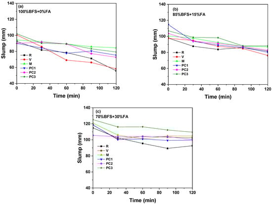 Evolution of the slump values with time for different binder proportions and admixtures. (a) 100% BFS + 0% FA, (b) 85% BFS + 15% FA, and (c) 70% BFS + 30% FA.