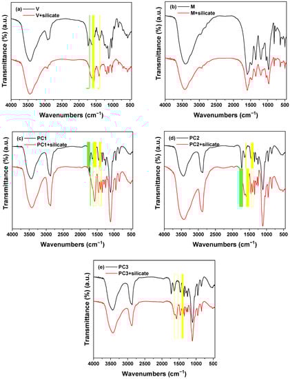 Infrared spectra of the five admixtures in the original state and sodium silicate medium: (a) V, (b) M, (c) PC1, (d) PC2, and (e) PC3. Green: a missing band; yellow: a new band.