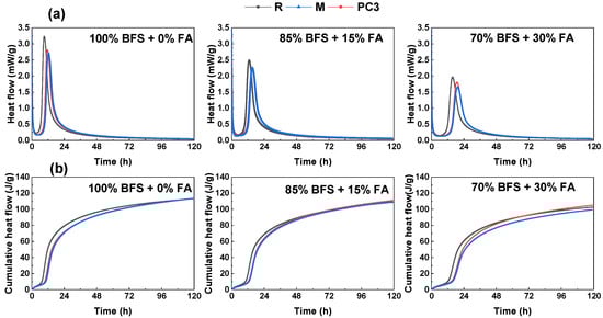 (a) Heat flow and (b) cumulative heat flow of the alkali-activated slag/fly ash pastes in the absence and presence of M and PC3 admixtures within the first 5 days.
