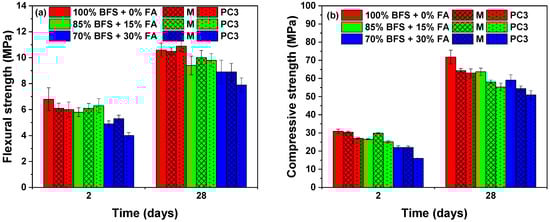 Mechanical strengths for the three formulations with M and PC3 admixtures at 2 and 28 days are reported in Figure 5. The flexural strengths at 2 and 28 days of the three formulations were in the range of 4.9–6.8 MPa and 8.9–10.6 MPa respectively, but these values decreased with the replacement of slag, see Figure 5a. This same trend is observed in Figure 5b for the compressive strengths, but the differences between the three alkali-activated slag/fly ash mortars were more marked at both ages. As the slag percentage in the formulation decreased, a lower calcium content was provided to the medium and lower precipitation of the C–A–S–H gel took place. In addition, the reaction between Ca2+ dissolving from slag grains and silicate anions from the alkaline activators also played an important role in the setting and calorimetry in these systems, as previously observed in Figure 1 and Figure 4. A driving force was provided by the formation of the gel to accelerate the chemical reaction leading to larger strength of alkali-activated binders cured at room temperature [5,45].