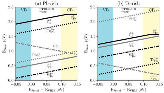Charged defect-formation energies (EForm) of high-symmetry defect configurations in PbTe under the (a) Pb-rich and (b) Te-rich conditions: Te vacancy (VTe: black dot-dashed line), Pb antisite by Te (TePb: black dotted line), Te interstitial (ITe: black solid line), Pb vacancy (VPb: gray dot-dashed line), Te antisite by Pb (PbTe: gray dotted line), and Pb interstitial (IPb: gray solid line). The x-axis represents the difference between energies of the Fermi level (EFermi) and the valence band maximum (EVBM). The yellow region indicates the conduction band (CB), the blue region the valence band (VB), and the white region the PBE energy gap with SOI ().