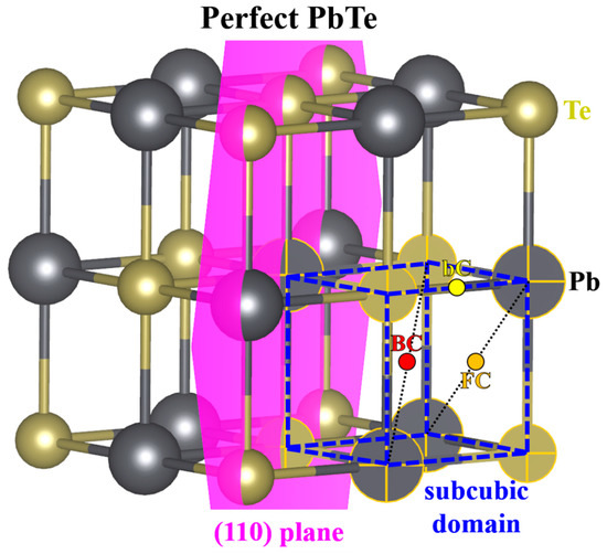 Figure 2 shows the rock-salt structure of pristine PbTe with a lattice parameter of 6.5758 Å. There are two basis positions in the primitive PbTe unit cell: Pb at (0 0 0) and Te at (1/2 1/2 1/2). Pb is surrounded by six first nearest neighbor (FNN) Te atoms, and Te has six FNN Pb atoms. The Pb–Te bond length was calculated to be 3.2879 Å. Here, a small Pb4Te4 cubic region in PbTe is called a subcubic domain, denoted by the blue dashed lines in Figure 2. The conventional cubic unit cell for PbTe contains eight units of the subcubic domain. Although the subcubic domain is not a unit cell, it is geometrically equivalent owing to the point symmetry of the PbTe lattice. Therefore, when searching for single-defect configurations of low-symmetry defects, defects in a single subcubic domain were only considered.