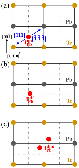 Figure 3a–c shows schematic atomic structures of the three important interstitial defects found here, namely , , and , respectively. In Figure 3a, is located at the center of the subcubic domain, which is one of the high-symmetry positions. This position has four FNN Pb atoms and four FNN Te atoms. Figure 3b,c display the structures induced by symmetry breaking: one is slightly displaced in the direction of an FNN Pb along , while the other is farther displaced toward a Pb along . The latter configuration can be formed only when forms a symmetric Pb–Pb dimer structure, which is a saddle point. Otherwise, the atom relaxes back toward the position.