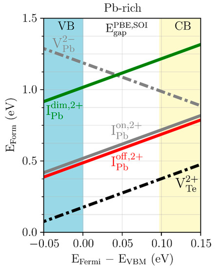 On the other hand, under Te-rich conditions, and have the lowest defect-formation energies. These results are generally consistent with previous calculations [41,42,43]. Note that the PBE band gap obtained from SOI calculation is 0.098 eV, which is smaller than the experimentally observed band gap (0.3–0.4 eV) due to the problem of band gap underestimation in DFT calculations. Thus, band gap correction can change the stability order between defects, especially for the Te-rich cases. However, for the Pb-rich case, the relative defect stability does not change with the Fermi level position because the defects with lower formation energies are all 2+ charge states. Thus, for Pb-rich off-stoichiometric PbTe, it is speculated that the defect physics will be less sensitive to the calculation setting or the choice of exchange-correlation functionals that is important for defect charge states.