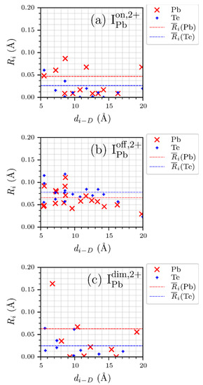 Next, the long-range effects of on PbTe were investigated. Figure 5 shows the relationship between the structural relaxation parameter and the defect distance. It is found that the long-range interaction between and PbTe is stronger when the defect symmetry is lowered, and the interaction range of exceeds 1 nm. is regarded as non-negligible if it is larger than 0.05 Å. For , is not negligible at 11.714 Å, whereas it begins to vanish at 12.623 Å. In addition, there is no split of over the whole range of . We think that at 19.865 Å may be due to the supercell size effect. However, for , a significant long-range interaction was observed in the defective supercell. is still 0.057 Å for 13.346 Å. Furthermore, there remain clear splits of until 8.658 Å, as can be seen in Figure 5b. From Table 1 and Figure 5, it is concluded that the off-centered defect structure is different from the on-centered one. The supercell containing also shows clear differences in structural relaxation from the other configurations, as seen in Figure 3 and Figure 5. Owing to , structural relaxation of Pb atoms in the supercell is significantly larger for the shorter distances than the others. However, the relaxation rapidly decreases compared to that in the off-centered configuration. In addition, the average of the supercell involving with respect to Pb and Te is smaller than that of but slightly larger than that of . Note that although the atomic structure involving is also of low symmetry, it has higher symmetry than the off-centered one.
