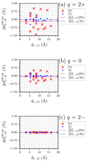 From the data of in Figure 6, the structural relaxation of Pb is much larger than that of Te regardless of the charge state, except for the 2− charge state. This is consistent with the results in Figure 5, where the introduction of has a greater effect on Pb than on Te in its supercell. In addition, as the charge state changes from positive to negative, the overall clearly decreases, indicating that the off-centered defect configuration reverts to the on-centered one. It also indicates that has a greater effect on the atomic structure of the PbTe lattice when its charge state changes from negative to positive, which is consistent with the charged defect formation energy (i.e., the energy reduction by breaking the symmetry is significant for the 2+ charge state but vanishes for the 2− state).