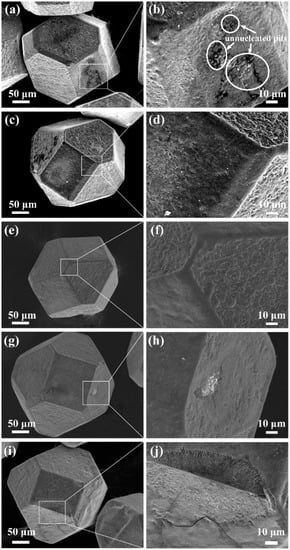 Cr coating diamond surface morphology under salt bath process with different parameters: (a,b) 950 °C/30 min, (c,d) 950 °C/60 min, (e,f) 950 °C/90 min, (g,h) 1000 °C/30 min, and (i,j) 1050 °C/30 min.