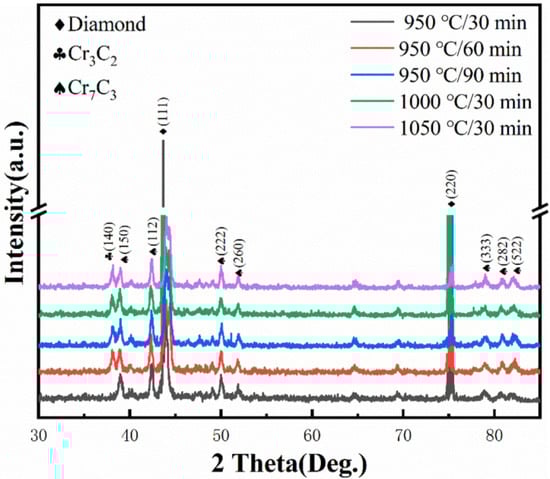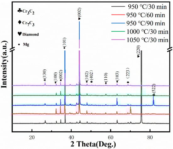 To study the phase composition of Mg/diamond (Cr) composites at different coating temperatures, phase analysis was carried out by XRD, as shown in Figure 5. Cr3C2, Cr7C3, diamond, and Mg were identified in all composite samples. Surprisingly, the intensity of Cr7C3 was significantly lower than that of Cr3C2, which may be because the residual Cr atoms continued to undergo carbide transformation during the insulation stage of the Mg/diamond composite, thus generating a portion of Cr3C2. In particular, the Cr3C2 phase was observed with an intense peak at 82.2° in the XRD pattern when the temperature was kept at 950 °C for 90 min, indicating that, as the holding time increased, the interface layer continued to transform to carbides with high C content.