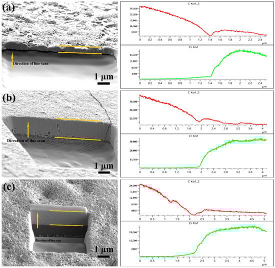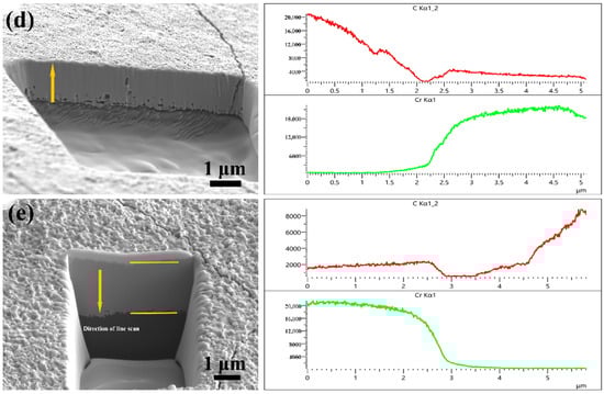 The film thickness of the Cr-coated diamond particles prepared under different processes was characterized and measured to more accurately quantify the influence of the coating process on the thickness of the coating. In previous studies, researchers mainly used SEM observation and the spherical weight gain method to estimate the thickness of the film [7,27]. However, it is difficult to directly observe the thickness of the film under a scanning electron microscope due to the typical hexahedral–octahedral structure of diamond, leading to the theoretical calculation method having an error. Therefore, in this paper, a focused ion beam (FIB) and scanning electron microscope (SEM) were coupled into an FIB-SEM dual-beam system. The high-current ion beam was used to strip the atoms on the diamond surface to achieve the interception of the microscopic cross-section of the coating structure, and then the cross-sectional layer shape was observed by scanning electron microscope, while the cross-sectional layer was analyzed by EDS line scanning. According to the change in element content, the thickness of the coating was accurately determined.