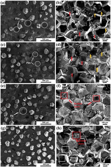 The microstructure of the composite material was characterized by SEM. As shown in Figure 4, in the uncoated Mg/diamond composite, the distribution of diamond particles in the matrix was uneven, and there were many pits on the surface. Moreover, the fracture surface shows that there were several holes and voids, and diamond particle shedding resulted in dimples. However, diamond particles were homogeneously distributed and tightly bound in the composites after Cr coating. The introduction of the carbide layer improved the interface bonding, but the mismatch in thermal expansion coefficient between the thick coating and diamond resulted in poor bonding, which indirectly affected the interface bonding strength of the composite and even led to severe interface separation. On the basis of the investigation of the fracture surfaces of composites, it can be speculated that the effect of holding time on the interfacial bond strength of the composites was less significant compared to the influence of coating temperature.