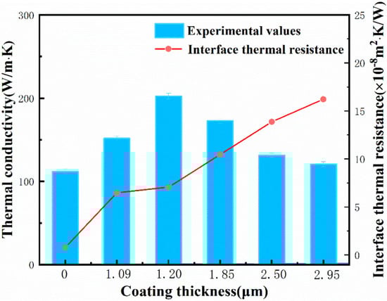 The TC of the Mg/diamond (Cr) composite increased first and then decreased as the thickness of the coating increased, as shown in Figure 6, attaining a maximum TC of 202.42 W/(m·K) at 1.20 μm coating thickness when 950 °C/60 min. The TC of the uncoated Mg/diamond composite was only 111.77 W/ (m·K), owing to the poor wettability between the Mg matrix and the diamond. The coating thickness affects the thermal conductivity Mg/diamond (Cr) composite to a certain extent, whereby a suitable coating thickness can improve the interface bonding, but an excessively thick coating can bring about a larger interface thermal resistance. In other words, the negative effect of the interface thermal resistance is stronger than the positive effect of the carbide layer, resulting in a decrease in thermal conductivity. In addition, according to the results of the interface analysis of the Mg/diamond (Cr) composite, the coating obtained at high temperature already had defects such as cracking and peeling, which would form pores at the Mg/diamond (Cr) composite interface or even result in a discontinuous interface. In the heat transfer process, the interface defects can cause serious scattering effects on the coupling of electrons and phonons, as well as weaken the thermal conductivity of the composite. The thermal conductivity of the Mg/diamond composite with a coating thickness of 2.95 μm was only 120.6 W/ (m·K), which is consistent with the differential effective medium (DEM) model analysis [28].