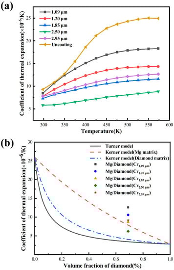 (a) Thermal expansion coefficient of Mg/diamond (Cr) composites; (b) theoretical calculation and experimental analysis results of thermal expansion coefficient of Mg/diamond (Cr) compo-sites.