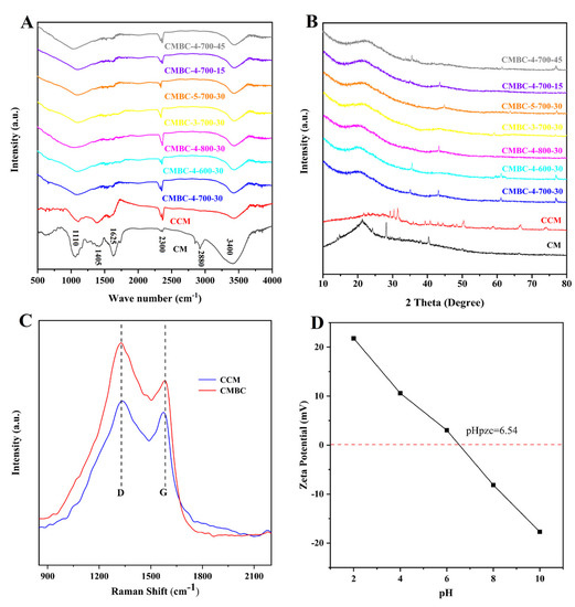 (A) FT-IR, (B) XRD tests of CM, CCM and CMBC prepared at different conditions, (C) Raman tests of CCM and CMBC-4-700-30 and (D) zeta potential test of CMBC-4-700-30.