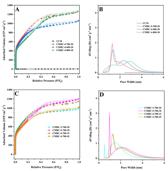 (A) and (C) N2 adsorption-desorption isotherms of CCM, CMBC-4-700-30, CMBC-4-600-30, and CMBC-4 800-30, CMBC-3-700-30, CMBC-5-700-30, CMBC-4-700-15, and 267 CMBC-4-700-45 and (B) and (D) their pore size distribution.