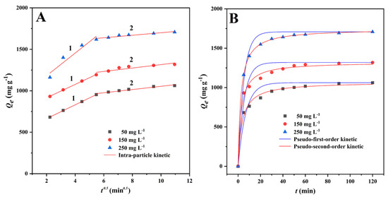 Non-linear fitting of MG adsorption kinetics onto CMBC-4-700-30 at different initial concentration at 303 K. (A) Intra-particle diffusion model and (B) pseudo-first-order and pseudo-second-order kinetics.