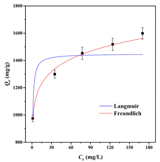 where Qm (mg/g) is the maximum adsorption capacity, nF is the Freundlich exponent, KL is the Langmuir constant, and KF is the Freundlich constant.