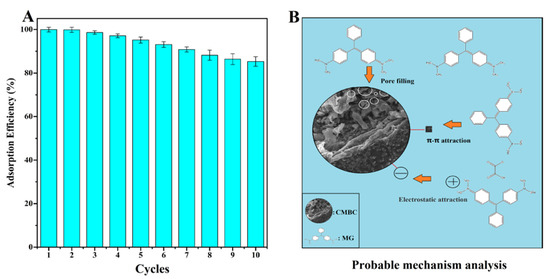 The reusability of CMBC-4-700-30 for MG removal was demonstrated in Figure 7A. The reusability of the adsorbent, which relates to the cost benefit of adsorbent, is an important indicator throughout the practical application phase [54]. Through further treatment of contaminants, the regeneration process can lessen the danger of secondary pollution. Repeated carbonization was used to eliminate adsorbent MG in preparation for the following cycle. The CMBC-4-700-30 still retained an 85.3% MG removal efficiency until 10 cycles were completed, which could be attributed to the deposition of byproducts on the surfaces of CMBC. The results indicate that CMBC-4-700-30 has high reusability for eliminating MG.