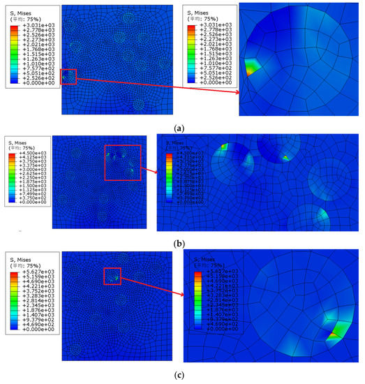It can be seen from Figure 5 that model 2 was first destroyed, and the failure strain was approximately 0.78%. The Von Mises stress nephogram of each model under 0.78% strain (as shown in Figure 6a) was extracted for comparative analysis: the maximum Mises stress of model 2 appeared in the particle aggregation area inside the model, and the particle aggregation caused the early failure of model 2.