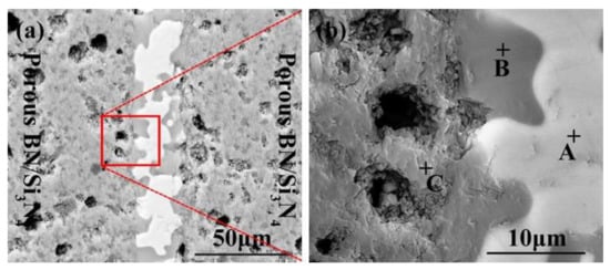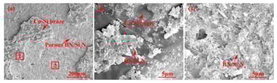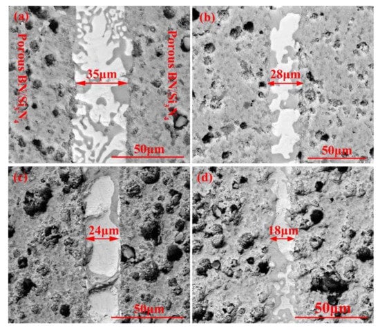 BN/Si3N4 composite ceramics show wonderful thermal shock resistance, favorable chemical durability, and especially low and stable dielectric constants and dielectric losses over wide temperature ranges [1,2,3,4]. They have become one of the most promising wave transparent material candidates for high Mach number aircraft radomes [5,6]. In order to satisfy the requirements of broadband transmission of the components and to further reduce the dielectric constant at high temperature, materials are usually designed to be porous [7]. However, the intrinsic brittleness of ceramic materials and the limitations of preparation processes restrict their application in large-scale and complex-shaped components. To solve the above-mentioned drawbacks, joining technology is widely used in ceramic material assembly. For instance, brazing and diffusion welding are common methods used for bonding ceramic materials [8,9,10,11]. However, due to the high surface roughness of porous ceramics, they cannot meet the basic requirements of diffusion welding. In contrast, brazing is more suitable for porous ceramic joining.