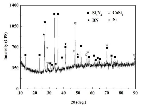 The SiCo38 alloy was applied to weld the porous BN/Si3N4 ceramic at 1320 °C for 10 min. Figure 2 illustrates the joint micrographs. The joint areas were homogeneous and no obvious new phase was observed. Figure 3 reveals the X-ray diffraction (XRD) results of the joint and it can be concluded that Si3N4, BN, CoSi2, and Si are present in the joint. Energy spectrum analysis (EDS) of the corresponding in Figure 2b was carried out and the results are given in Table 1. From the combination of the XRD and EDS data, it can be deduced that the phases of the A, B, and C locations in Figure 2b are CoSi2, Si, and Si3N4, respectively. The above results indicate that no new phase is formed in the joint.