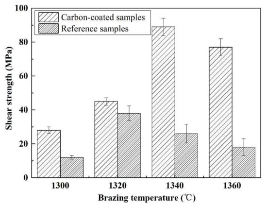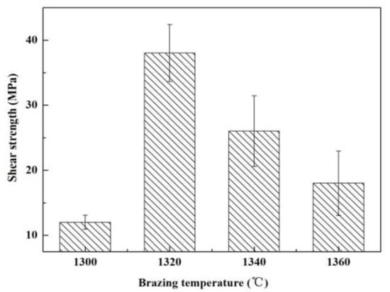 The joint strength can mainly be affected by the interface bonding force, weld width, and phase distribution. When the temperature is 1300 °C, the viscosity of the filler metal is relatively high. Because there is no chemical reaction at the interface, the filler is mainly connected to the substrate by the nailing effect. The high viscosity of the filler leads to poor wetting and spreading; therefore, the nailing effect between the substrate and the filler metal is weak, which makes the interface bonding force weak. In addition, the width of the weld is larger at a lower temperature (exhibited in the Figure 4a). The large weld may not be conducive to improving the joint strength [20], hence, resulting in a lower joint strength.