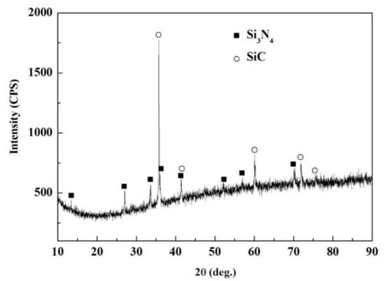 Figure 7 shows the appearance characteristics of the carbon-coated porous BN/Si3N4 ceramic joints by carbon coating bonded with the SiCo38 alloy at 1340 °C for 10 min. Figure 7a,c shows that the joint is connected well, and no obvious holes or cracks are observed at the interface. The other one remarkable phenomena of the joint is the appearance of nanowires in the pores at the interface. The nanowires possess a ball at the ends (as shown in Figure 7b). In order to determine the reaction product in the joint, XRD and EDS experiments were undertaken and the test results are given in Figure 8 and Table 2. The XRD results in Figure 8 show peaks at 2θ = 36°, 41°, 60°, and 72° resulting from silicon carbide. This demonstrates that a reaction product is formed in the joint.