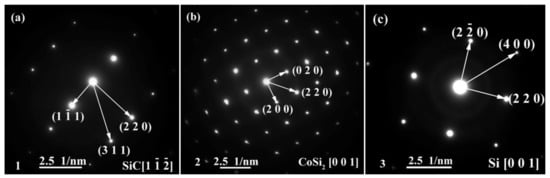 SAED patterns of “1”, “2”, and “3” marked in Figure 9a showing: (a) SiC, (b) CoSi2, and (c) Si.