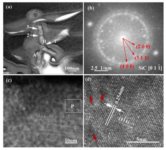 TEM image (a) and SAED pattern (b) of SiC nanowires, where (c) is HRTEM image of area “B” labelled in (a), and (d) is a magnified HRTEM image of area “P” labelled in (c).