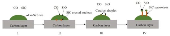 The above analysis shows that SiC nanowires are grown using the VLS method during the joining. This suggests that the original components of the SiC nanowires are gaseous and transition metals are present as catalysts during the brazing process. In other words, in the system consisting of the SiCo38 filler and the carbon-coated porous BN/Si3N4 ceramic, solid carbon and liquid silicon are first converted into gases, and cobalt in the filler plays a catalytic role in the synthesis of the nanowires. Therefore, the formation of the nanowires may consist of the following four parts (as shown in Figure 12) [21,27]. The first part is the formation of CO and SiO gases. They may be formed by the reaction of oxygen in the system with the carbon layer and the liquid silicon, respectively (as shown in Equations (1) and (2)). The second part is the formation of the SiC crystal nucleus, which is likely to be formed by the reaction of liquid silicon or gaseous SiO with the carbon layer (as shown in Equations (3) and (4)). The third part is the formation of catalyst droplets. This is mainly because the SiC crystal nucleus gradually diffuses from a high concentration region to a low concentration region, and finally precipitates on the surface of the liquid filler. In this process, the liquid filler is pushed out onto the surface of the crystal nucleus, and finally forms catalyst droplets on the surface. The gaseous CO and SiO in the system then continue to dissolve into the catalyst droplets, and further react to form a new SiC crystal nucleus. When the SiC crystal nucleus in the droplets reaches saturation, it precipitates from the solid-liquid interface and grows into nanowires along the one-dimensional direction (as shown in Equations (5) and (6)).