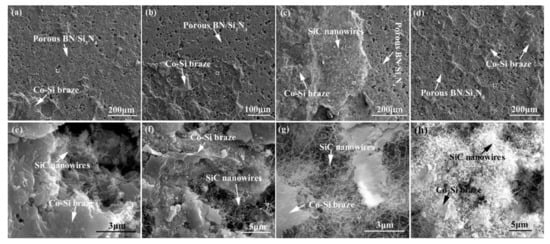 Figure 15 shows the influence of welding temperature on the joint strength of the carbon-coated porous BN/Si3N4 joints. The corresponding fracture morphologies of the joints are given in Figure 16. From Figure 15 can be observed that the joint strength increases gradually from 28 to 89 MPa when the temperature rises from 1300 to 1340 °C. However, the joint strength decreases to 77 MPa when the temperature continues to rise to 1360 °C. From the fracture morphology of the joints, it can be seen that the fractures mainly occurred at the interface, indicating that the interface was a welding weak area. Figure 17 shows the form of connection of the SiC nanowires in the joints. It can be observed from Figure 17 that the SiC nanowires with different directions may form a bridging connection during the growth process. From Figure 18 can be seen that a large number of nanowires have been pulled off during shearing. The SiC nanowires generated at the interface may affect the joint strength. When the brazing temperature is low, the SiC nanowires are short and there are few (as shown in Figure 16e). Moreover, most of them only grow in the pores without forming an effective bridge between the substrate and the filler. Hence, the interface adhesion force is weak, and the joint strength is low. When the temperature rises from 1320 to 1340 °C, the length of SiC nanowires increase gradually (as shown in Figure 16f,g), which can consume energy during the pulling out in the process of shearing. Therefore, the joint strength gradually increases. However, the nanowires coarsen and deform as the temperature continues to rise (as shown in Figure 16h) and the joint strength decreases. This may be due to the fact that SiC tends to grow into other types of nanowires at higher thermodynamic temperatures, such as 4H, 6H, since this stacking error will be more common and thus this will lead to the formation of malformed, mechanically weak nanowires. In brief, the origin of the increase and decrease of joint strength could be linked to the morphology and density of SiC nanowires. More detailed and in-depth studies are needed to confirm how they affect the joint strength.