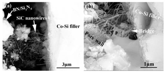 At present, there are few reports on the direct brazing of porous ceramics. Porous Si3N4 ceramics are usually brazed to metals (such as TiAl and Invar). Ag-Cu-Ti fillers are mainly used in the joining process [12,13,14,15]. However, the joint strength is low on account of the large discrepancy in the physicochemical properties between the substrate and the filler metal. To improve the connection of the joints, we have previously reported a silicon-based filler for brazing porous Si3N4 ceramics [16,17]. Before bonding, porous BN/Si3N4 ceramics were preimpregnated with phenolic resin organic solution assisted by subsequent high-temperature treatment to prepare carbon coating on their surfaces, which could provide carbon source for the generation of SiC nanowires during the bonding process. The free Si in Si-Re (Re = Ti, Co) filler is used as silicon source, the transition group metal Re is used as catalyst, and the pores of the substrate can provide space for the growth of nanowires. During the brazing process, the carbon coating on the substrate and free Si in the solder react in situ under the catalytic action of Re, and SiC nanowires are formed at the interface. Results demonstrated that the bonding strength was greatly enhanced by pre-fabricating carbon coating on porous ceramics surface, resulting in the creation of SiC nanowires in the joint. However, the forming process and strengthening mechanism of SiC nanowires to the joint have not been clarified.