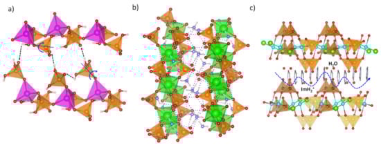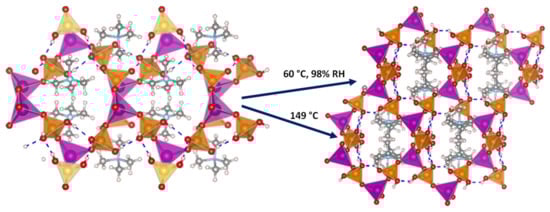 Additionally, an extrinsic proton conduction, associated with surface proton transport, can also result from specific chemical modification and/or induced morphological changes, e.g., with formation of nanoplatelets or nanorods particles [,]. Water molecules act both in the formation H-bonding networks inside the framework and as proton carriers. Moreover, other guest species, including organic moieties, can be inserted in their structure following different strategies, such as intercalation [,,], template [,], and post-synthesis adsorption [,,].