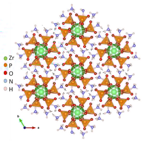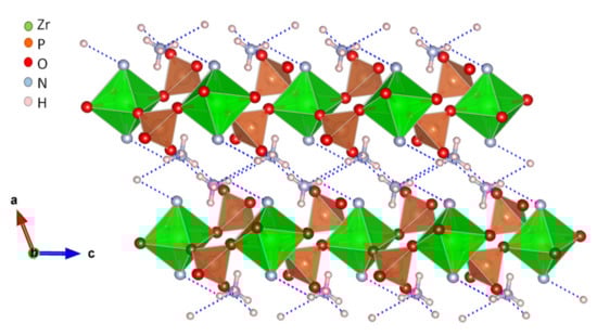 In the structure of α-ZrP, planar Zr atoms are coordinated by the three oxygen atoms of HO-PO3− groups, while the P-OH bond points toward the interlayer space giving rise to small cavities, where the lattice water is located. Although this water forms hydrogen bonds with P-OH groups, an extended interlayer hydrogen bond network is absent in this structure []. On the other hand, the structure of γ-ZrP consists of a biplanar Zr atomic system connected through bridge PO43− groups, while the externally located H2PO4− groups complete the octahedral coordination of the Zr atoms.