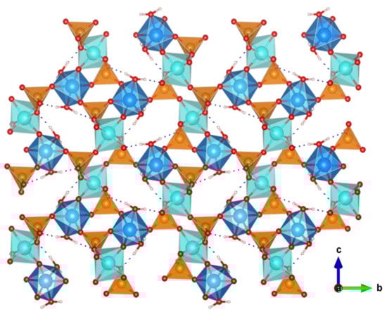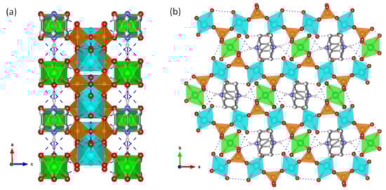 (a) View, along b-axis, of the chain packing and (b) 3D-framework of compound (NH4)3Zr(H2/3PO4)3, with H-bond network (dashed blue lines) highlighted (adapted from []).