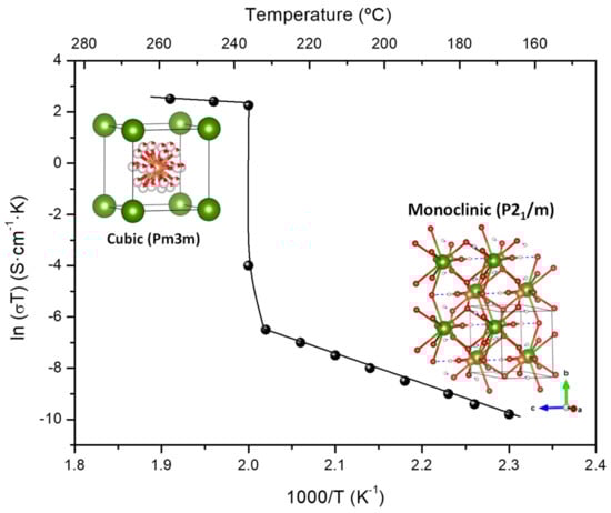 Solid acid proton conductors, with stoichiometry MIHyXO4 (MI = Cs, Rb; X = S, P, Se; y = 1, 2), have received much attention because they exhibit exceptional proton transport properties and can be used as electrolytes in fuel cells operated at intermediate temperatures (120−300 °C). The fundamental characteristics of these materials are the phase transition that occurs in response to heating, cooling or application of pressure [,], accompanied by an increase in proton conductivity of several orders of magnitude—referred to as super protonic conductivity (Figure 7).