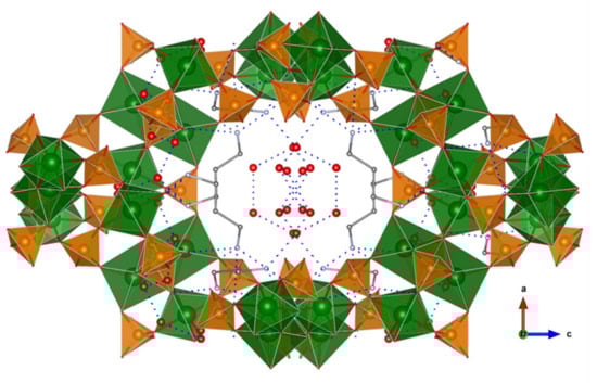 A structurally different proton-conductor metal pyrophosphate is the mixed template-containing vanadium nickel pyrophosphate, (C6H14N2)[NiV2O6H8(P2O7)2]·2H2O (Figure 6). Its crystal structure is composed of octahedrally coordinated V(IV) and Ni(II) interconnected through bridging pyrophosphate groups, thus creating a 3D framework of [NiV2O6H8(P2O7)2]2− unit charged-compensated by protonated DABCO molecules. Hydrogen-bonding networks inside 3D channels facilitate the proton transport, and thus this material exhibits a remarkable proton conductivity of 2.0 × 10−2 S·cm−1 at 60 °C and 100% RH (Table 1) through a Grotthuss-type proton-transfer mechanism (Ea = 0.38 eV) [].