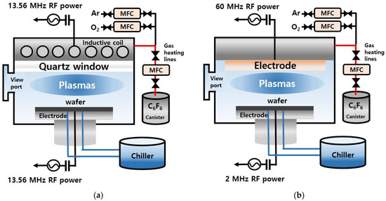 2 using perfluorocarbon (PFC)-based etch gases, even though the etch rates are slower than the ICP system, the CCP system is generally used due to the higher etch selectivity over mask layers caused by low dissociation of fluorocarbon gases at the lower plasma density in addition to the higher ion bombardment energy at the same low-frequency power to the substrate.