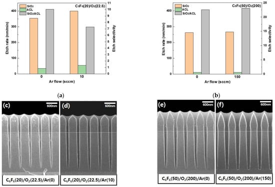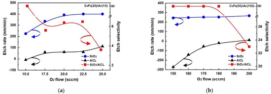 2/ACL was observed for the oxygen flow rate of 150–180 sccm, and the etch selectivity of 23 was observed for the oxygen flow rate of 200 sccm. However, for the SiO