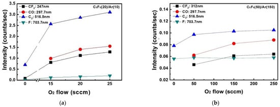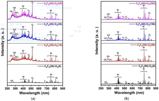 Figure 3a,b, optical emission peaks from O (777.3, 844.8 nm), F (685.7, 703.8 nm), Ar (696,7, 706.8, 738.6, 750.4, 772.5, 794.9, 800.7, 801.6, 811.6, and 826.5 nm), CO (282.7, 296.8 nm), C