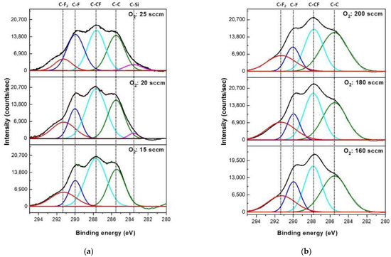 Figure 5a, the increase in oxygen flow rate from 15 to 25 sccm decreased C–C bonding and C–CF bonding slightly possibly due to the greater dissociation of species from the plasmas as shown in
