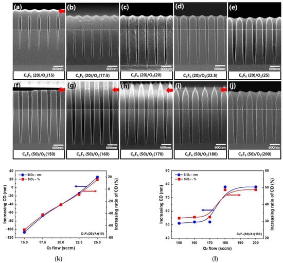 Figure 6k, for the ICP system, due to the clogging of the ACL mask top area at the lower oxygen flow rates, the hole pattern diameter smaller than the ACL mask hole diameter was observed for the oxygen flow rate from 15 to 20 sccm (from −66% at 15 sccm to −25% at 20 sccm), but due to the increase in hole diameter with increasing oxygen flow rate, the hole diameter equal to the ACL mask hole diameter CD or higher was observed with the further increase in oxygen flow rate from 22.5 to 25 sccm (from −8% at 22.5 sccm to +15% at 25 sccm). Therefore, for the oxygen flow rate of 20~22.5 sccm, highly anisotropic SiO